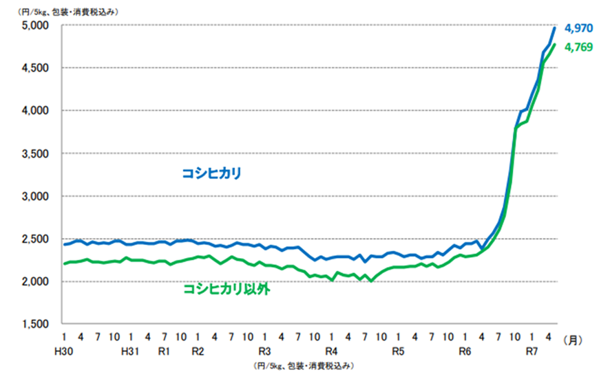 農林水産省は10月21日、2025年産の新米が業者間で9月に取引された価格を発表した。 玄米60キロあたり税込み3万6895円で、24年産の昨年9月の取引価格より1万4195円(63%)高く、比較できる06年以来の最高値を更新した