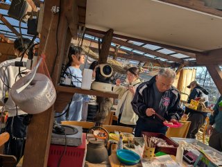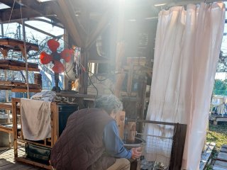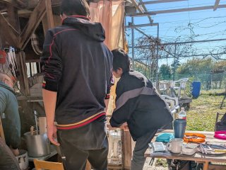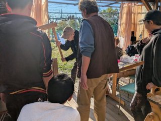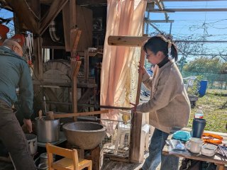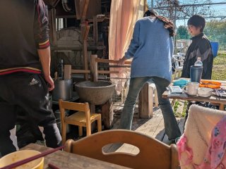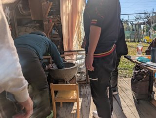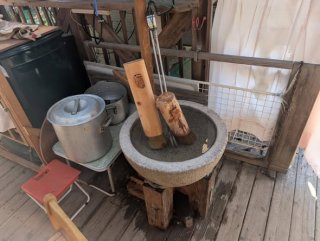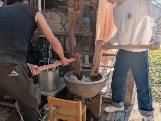 前日から餅米を水に浸し 当日は開始2時間前に農園に入りお湯を沢山沸かして 石臼を温め 餅米を蒸します