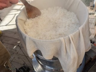 餅米を蒸し
