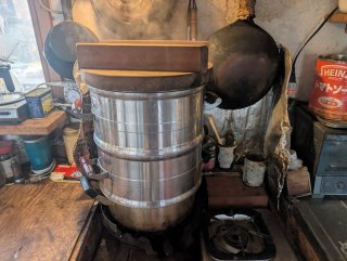 午後3時頃から お米を2kgに分け2段の蒸篭で蒸します