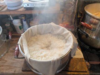(2kgの米を水に浸し蒸し上げると概ね2倍弱の3.5〜4kgの重さと成り 麹を塗し発酵する時 米の水分を吸い発酵します 麹が出来上がった頃には2.4〜2.6kg位)