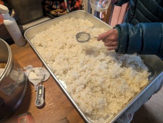 午後4時 蒸し上がりを確認 大きなバットに移し 40度位を目安に荒熱を取ります 1kgに対し3gの麹菌の散布