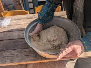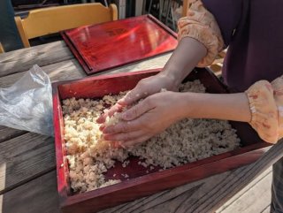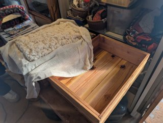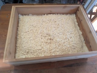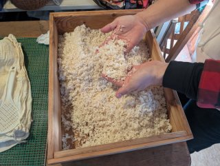 一次発酵24時間後の1月16日(金)午後4時 蒸し布に包んだ米麹を 木製の麹蓋に 解しながら移します