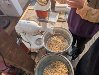 茹で上がった大豆をミンチャーで潰します